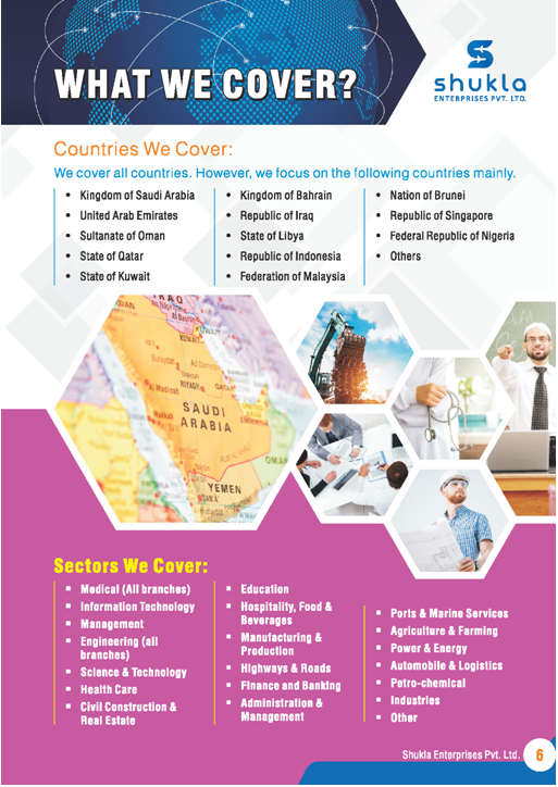 "Shukla Enterprises PVT. LTD." is a Delhi-based pioneering human resource management agency for exportation of manpower services across the Gulf region and other countries. The agency was established and approved by the Ministry of External Affairs, Government of India in 1998